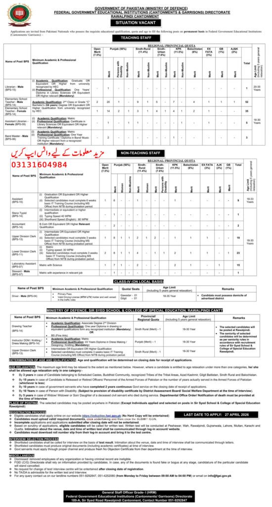 The Federal Government Educational Institutions (Cantonments & Garrisons) Directorate, Rawalpindi has announced a wide range of job opportunities for Pakistani nationals. These permanent positions are available across various regional and provincial quotas, offering a career in one of the most prestigious educational networks in Pakistan.