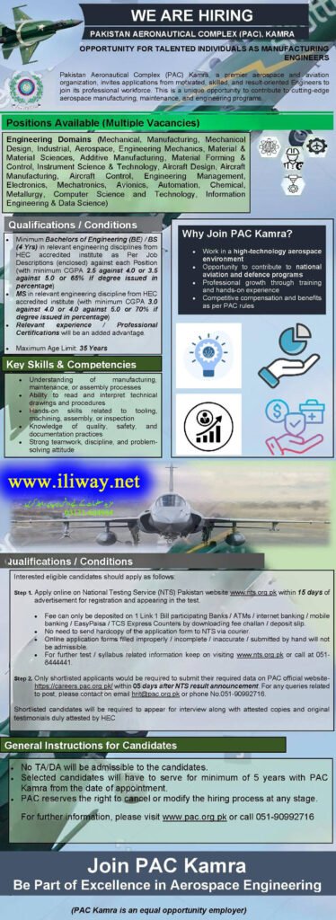 The Pakistan Aeronautical Complex (PAC) Kamra has announced multiple vacancies for talented and result-oriented individuals to join its professional workforce. This is a prestigious opportunity for engineers to contribute to cutting-edge aerospace manufacturing, maintenance, and national defense programs.