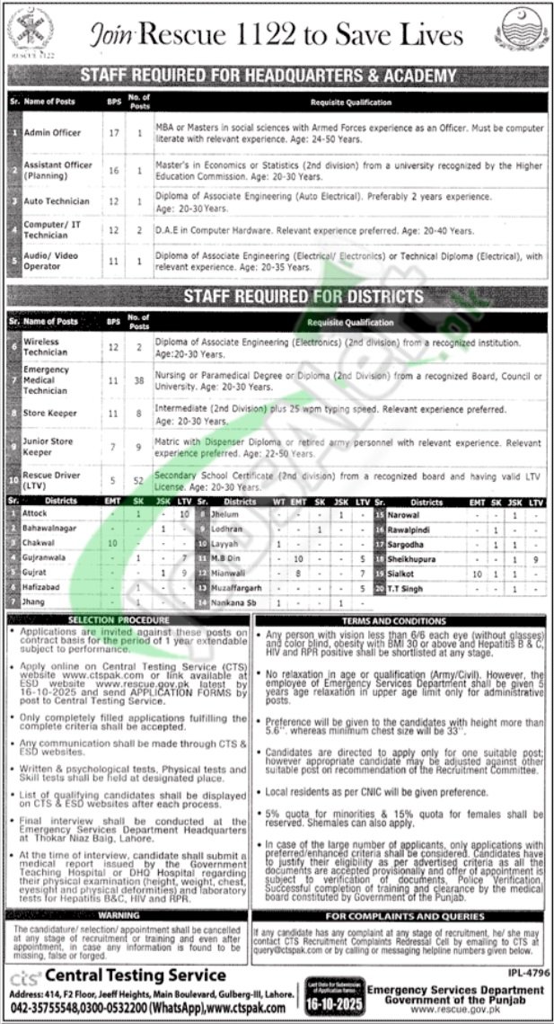 Rescue 1122 Punjab Jobs 2025 – Apply via CTS (Emergency & Technical Staff)
